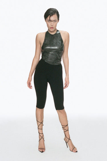 Our Harley Capri in Black is designed for a tailored fit with a flattering high waist and belt loops for easy accessorizing. Styled here with latex from our spring collection - coming soon.