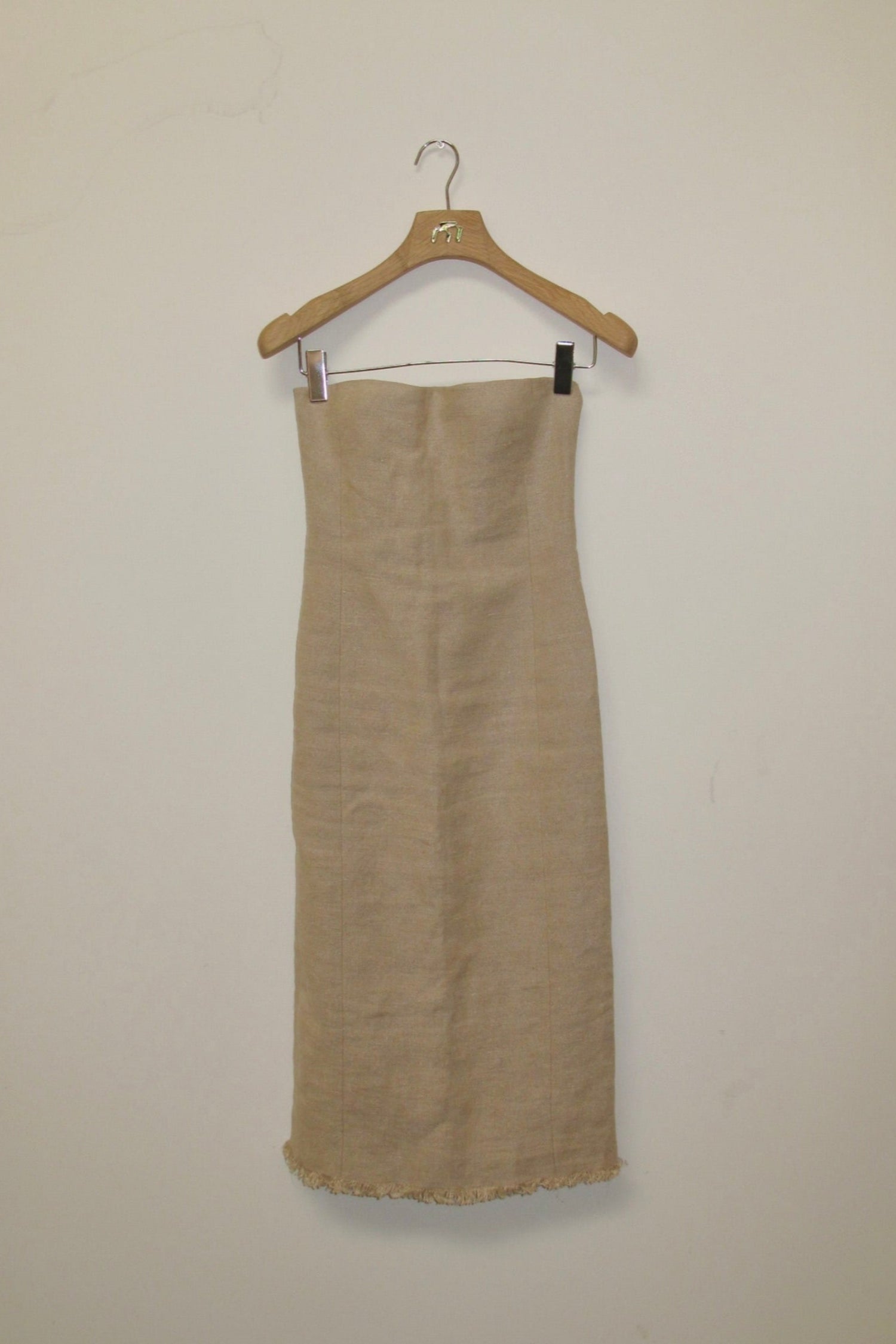 Paco Rabanne textured linen strapless dress with a clean column silhouette and raw hem.