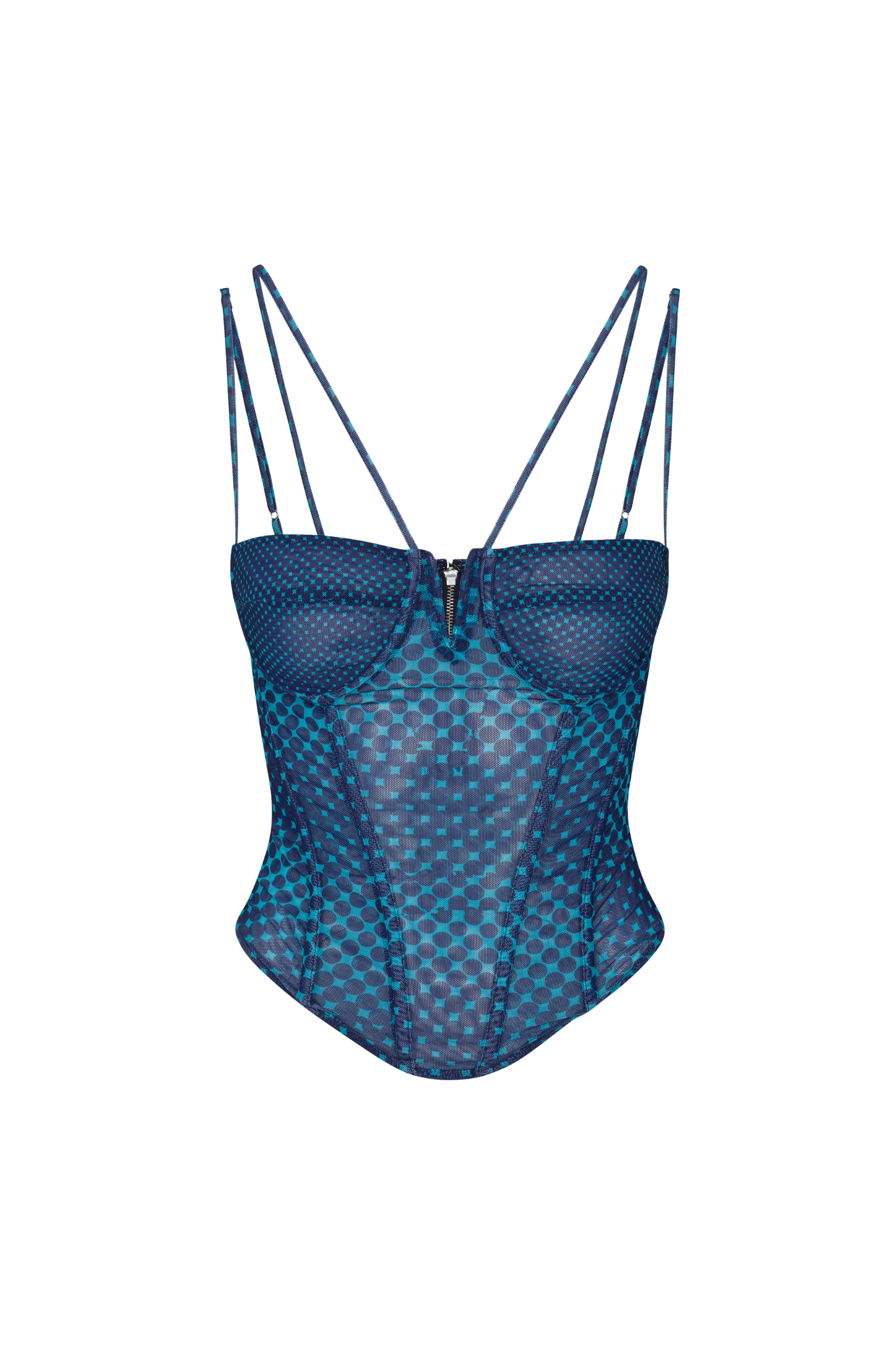 The Aphex Corset - She's all that and more. The Aphex Corset in Warped Dot Cobalt gives a sultry silhouette, featuring an underwire bust, boning throughout, and strappy details. Crafted from our Sculpting Mesh, she's designed to hug the body in just the right way.
