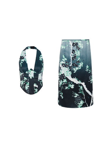 Stretch satin set includes the Ari Corset and Maria Skirt in our hand-drawn Sakura print.