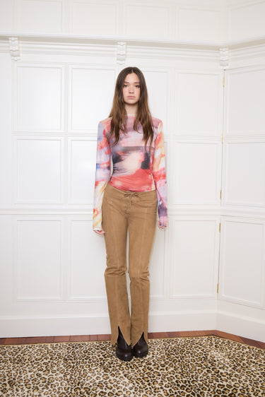 The Element Pant - now in Tan Suede. Features a front lace up closure, slits at each hem, and detailed seams. Fits like a glove.