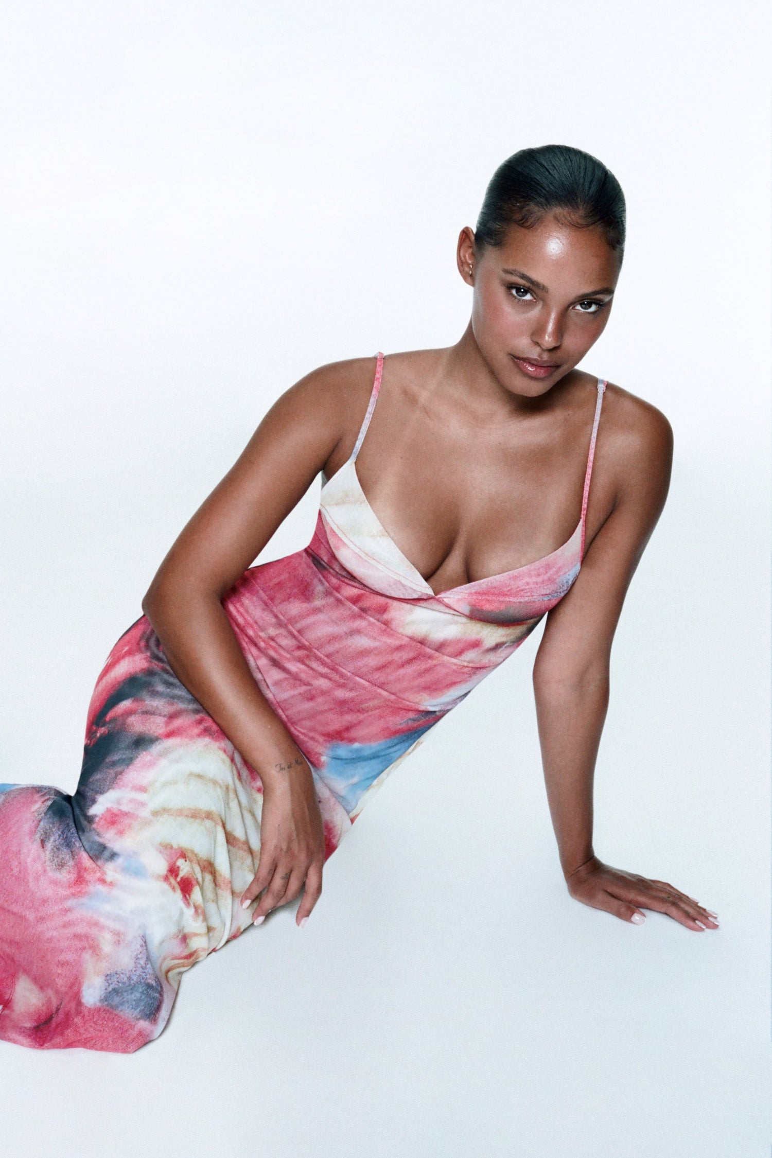 Jasmine is 5'9" and wears a size S. Her measurements are: Bust-34” Waist-23.5” Hips-34”.